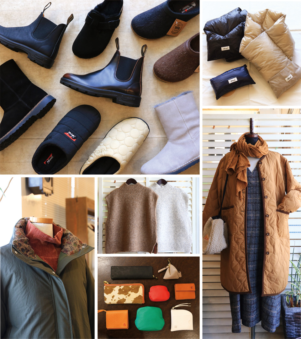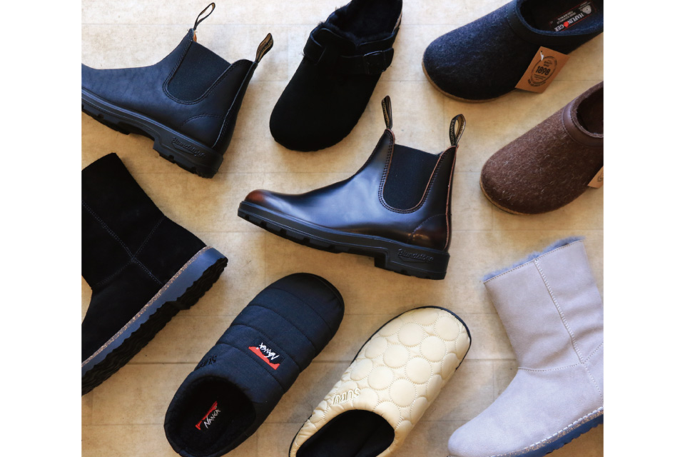 ウールにニット、ダウンにキルティング…冬ならではの素材で遊べる季節の到来。BEANSにも今季のアイテムが豊富に揃っています。冬の足元には定番のブーツをはじめ、軽くて暖かいサンダルもおすすめ。「BIRKENSTOCK」「Blundstone」「SUBU」など、履き心地も快適なコンフォートシューズをシーンや服装にあわせて選べます。コートなどのアウターや、暖かくて着まわしのきくニットも豊富。組み合わせを考えるのも楽しい時間です。また、コンパクトに持ち運べる「NANGA」のダウンマフラーなどの小物や、色・柄に心はずむレザーアイテムは、贈り物にもおすすめ。あなた自身や大切な人に、とっておきの逸品を選んでみませんか。