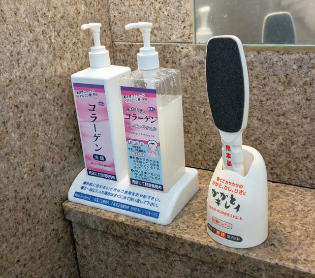 洗い場には、ピーリングジェルや、かかとケアアイテムが設置されており、お試しも可!売店で購入もできます。