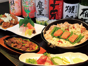 九州本場から届いた馬刺や牛ホルモンなどが味わえ、山口の様々な銘酒・焼酎も充実した本格居酒屋。コースのもつ鍋は、牛モツのぷりぷり食感と和風だしが香る逸品です。その他、すき焼きコース¥3,500もオススメです。さらに飲み放題には+¥500で、地酒3種(貴・東洋美人・雁木)が追加されるお得なアップグレードプランも!!お座敷や50人までの大人数が入る別館もあり、どんな宴会にも対応できます。