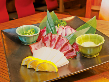 もつ鍋コースは、馬刺付き¥3,500(一例、ドリンク別)。通常のもつ鍋コースは¥3,000。