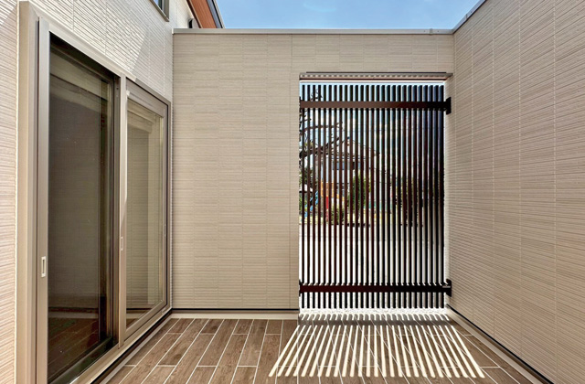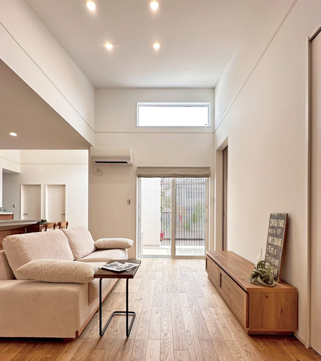 吹き抜けが開放的な広々リビングの先にはプライベートテラスコート