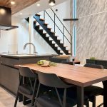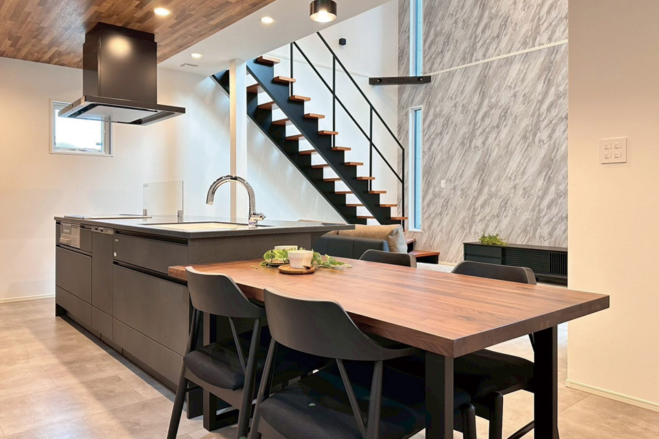 温かみのある木目と異素材のアクセントパネルの組み合わせにアイアン階段が調和したLDK。