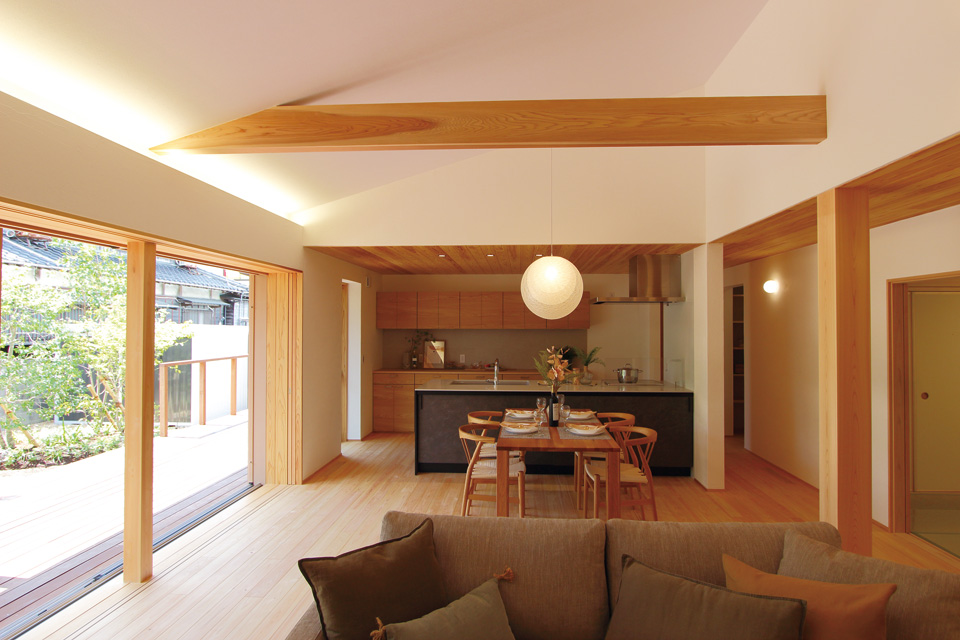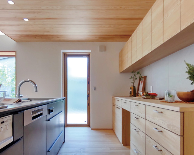 大きなLDKが魅力の平屋。天井や床には温かみのある無垢の木がふんだんに使われ、経年変化を長く楽しめる住まいです。キッチンは、テーブル側の面に大容量収納スペースが。