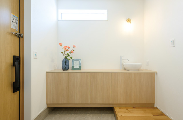 手洗い場付きの玄関。オリジナルの下駄箱も魅力です。