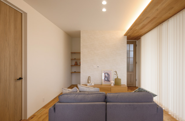 木の天井と間接照明による、落ち着いた空間が印象的なリビング。