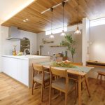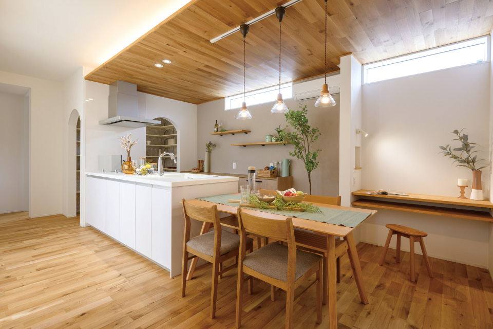 床と天井に無垢材を使ったダイニング空間。キッチンと横並びで配膳もスムーズに。