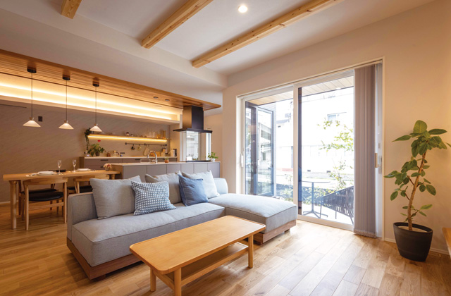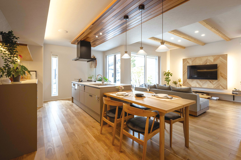 天井の装飾や梁見せ天井、床など家の中には国産木材がたっぷり。