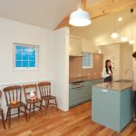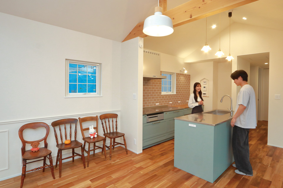 白と木目がメインのT様邸。キッチンは水色を主役に、茶色のタイルがアクセント。