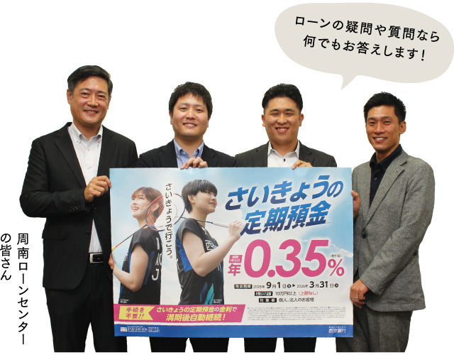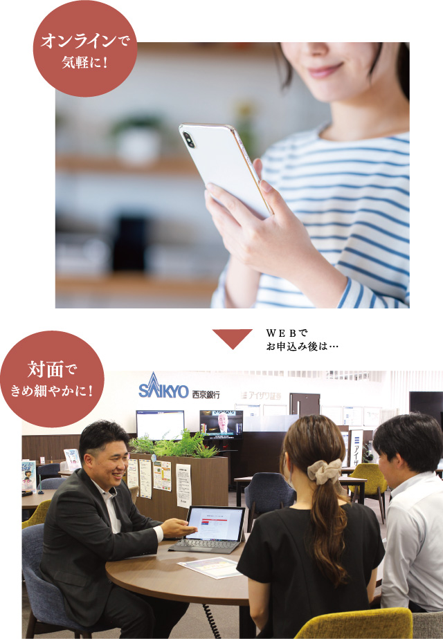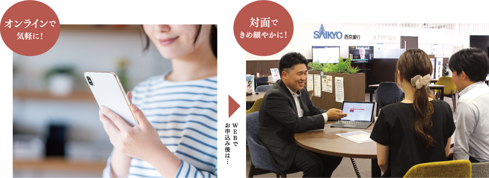 住宅ローンって、色々書類を準備しないといけないし、時間もかかる…なんてイメージがありませんか?西京銀行の住宅ローンは、スマホやパソコンからいつでもどこでも事前申込み可能!用意が必要な書類も2種類のみと少なく、登録は最短5分で完了!忙しくて何度も足を運ぶのが難しい方でも気軽にお申込みできます。しかも、利用される方の要望に応えて対面でのサポートも強化。WEB申込み後はローンのエキスパートがいるローンセンターでしっかり対応してくれますよ。ローンに関することなら、何でも質問OK。「直接話を聞いてみないと不安だな」という方は、ローンセンターで対面でのご相談がおすすめです。下記『住宅ローンについてはこちら』のリンクからアクセス、またはコールセンターにお電話を。