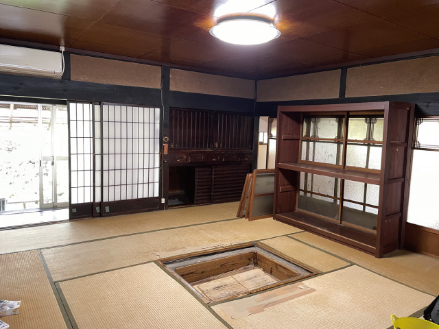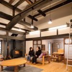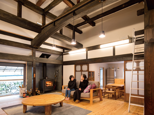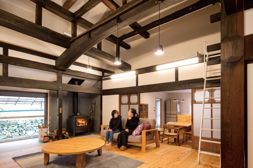 「築100年の古民家リノベーション」。大正に着工した古民家を改装した、岩国市の施工例。梁や柱をあらわにした空間が印象的です。