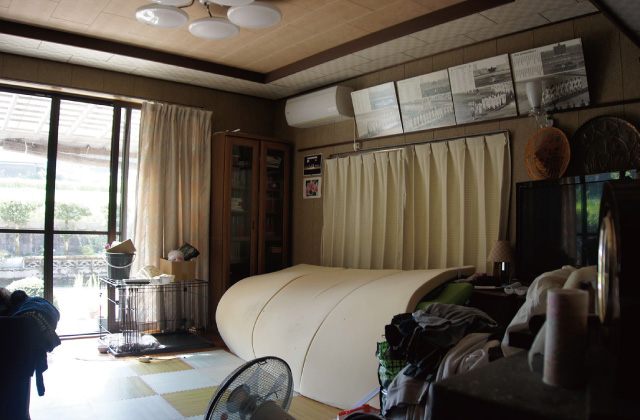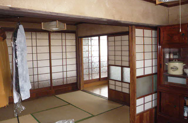 壁や襖の間仕切りを撤去して、広いリビングを実現!壁には埋め込み型の棚を設置。