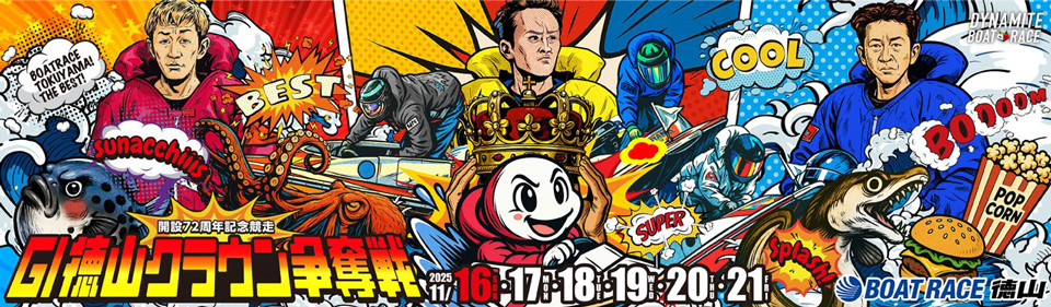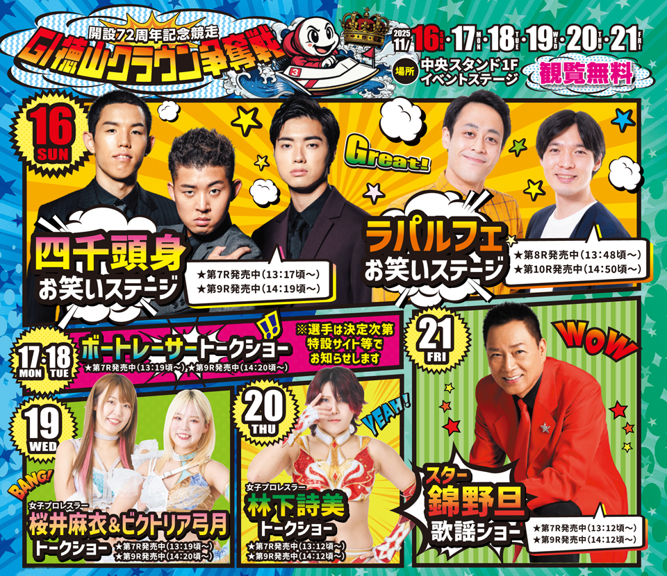 ボートレースファン必見の「GⅠ徳山クラウン争奪戦」が、11月16日㈰から21日㈮まで、ボートレース徳山で開催されます。この大会は、トップクラスのレーサーが集結するだけでなく、連日開催されるイベントも魅力の一つ。