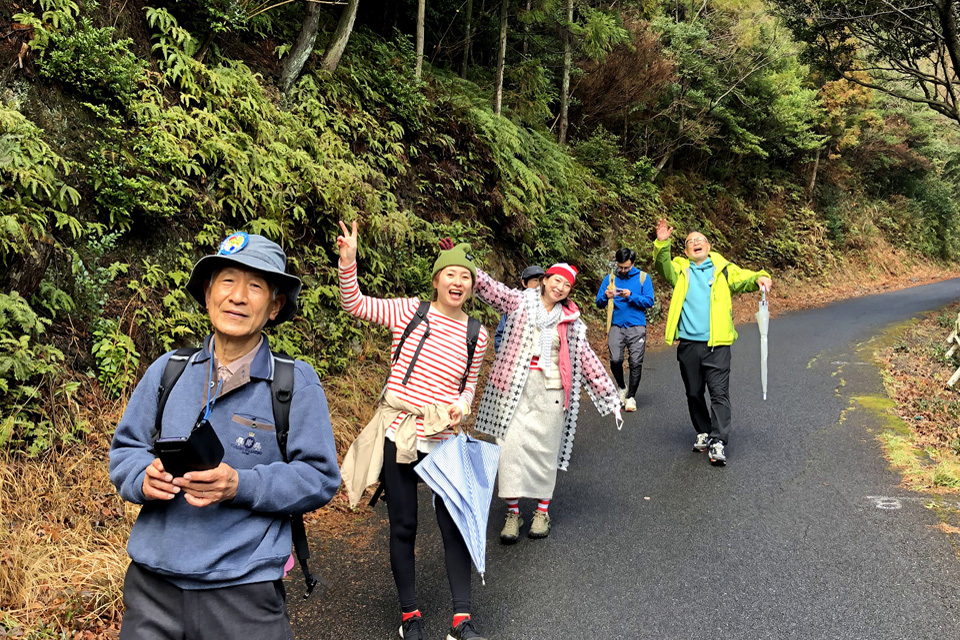 気を取り直して再スタート。傘を差しながら、一緒に歩いてくださっている読者の方と和気あいあいとトークを繰り広げていると、6kmコース折り返し地点・8kmコース折り返し地点を過ぎ、あっという間に13kmコースの中間地点(折り返し地点)に到着。