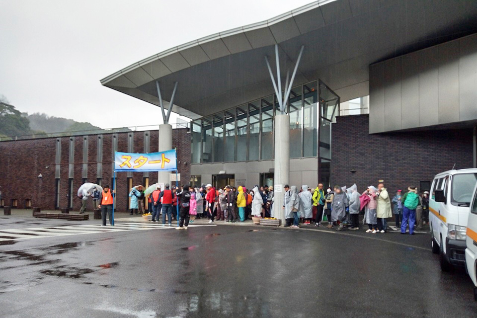 会場では雨のため、当初の予定より30分ほどスケジュールが遅れていましたが、まずはゴールまでの所要時間が最も長く、参加者が最も多かった13kmコースの参加者がスタート!