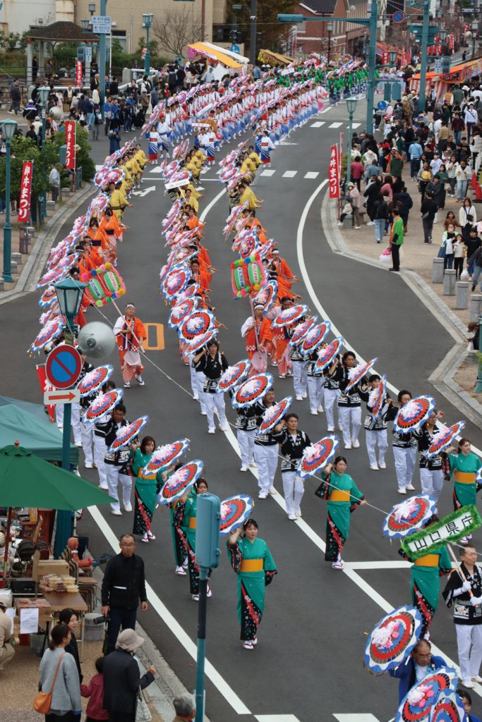 柳井三大祭のひとつで、秋の収穫を感謝して行われる秋祭り。「農林水産業展」や「福祉の市」などが行われ、最大の見どころは、麗都路通りで行われる花傘おどり!色とりどりの衣裳や傘と鈴の音から繰り広げられる演舞は、息を呑む美しさです。地元食材を使用したタコおこわなどの販売もあり。
