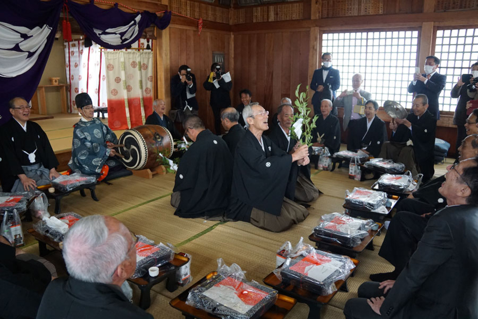 防府市大道小俣地区に伝わる神事で、鎌倉時代から800年以上もの間受け継がれている「笑い講」。防府市の無形民俗文化財に指定されています。全国的にも珍しい笑いの神事で、紋付き袴で正装した講員たちが、榊を手に「ワーハッハッハッ」と3回笑いあい、今年の収穫の感謝と来年の豊作を祈り、1年の憂さを豪快に笑い飛ばすというものです。「笑う門には福来る」のことわざにもあるように、神事の様子を観ているだけでも運が開けそう!