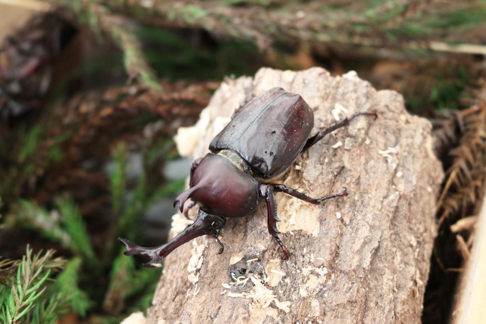 約20年前に始まったこちらの施設では、かぶと虫の飼育も行っています。栄養のある腐葉土にしか卵を産まないかぶと虫(クワガタは木くずに産む)のために、大量の腐葉土を敷いた養殖場にたくさんの成虫ペアを放し、時期が来ると、羽化して土から上がってきた成虫を採集する、という方法でかぶと虫を育てています。