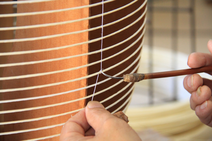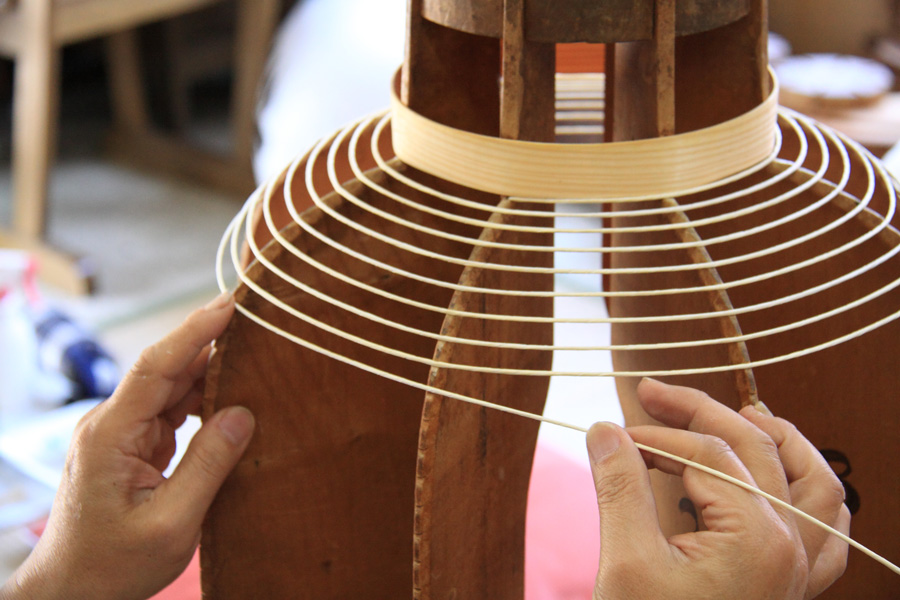 ▲和紙を巻いたワイヤー。昔は“竹ひご”を使っていたそうです。