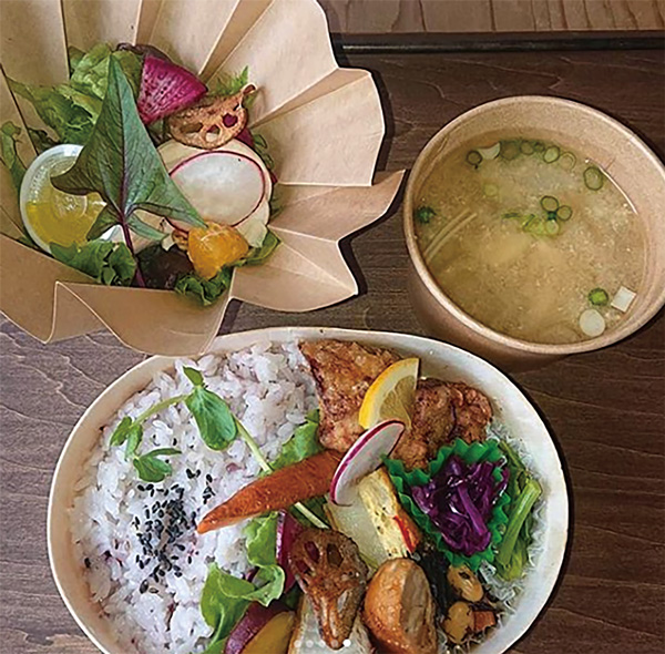 老舗工務店のおかみさんが家族のために作ってきた食事をベースに作る、からだにやさしいお弁当。お味噌汁やサラダをつけることもでき、どれもたっぷりの野菜をはじめ、様々な食材をバランス良く摂ることができます。