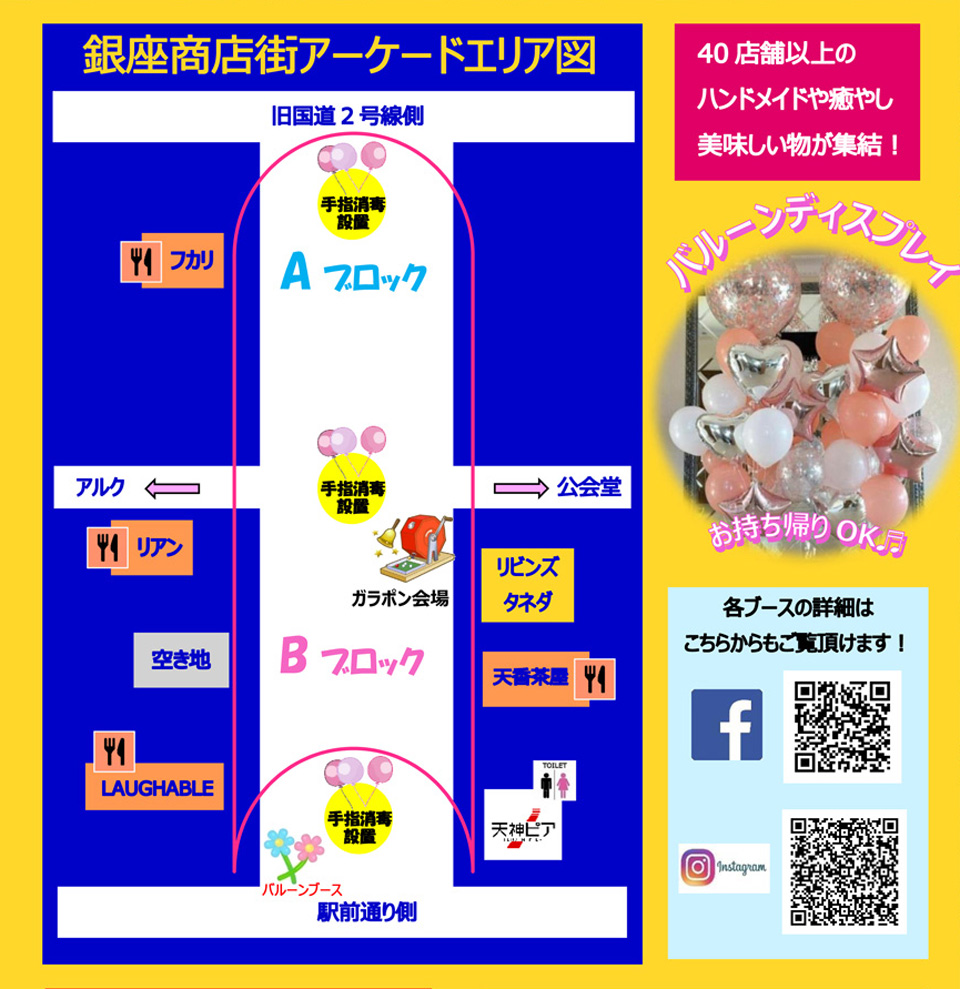 防府市の天神町銀座商店街のアーケードに約40店舗がずらりと登場