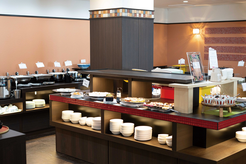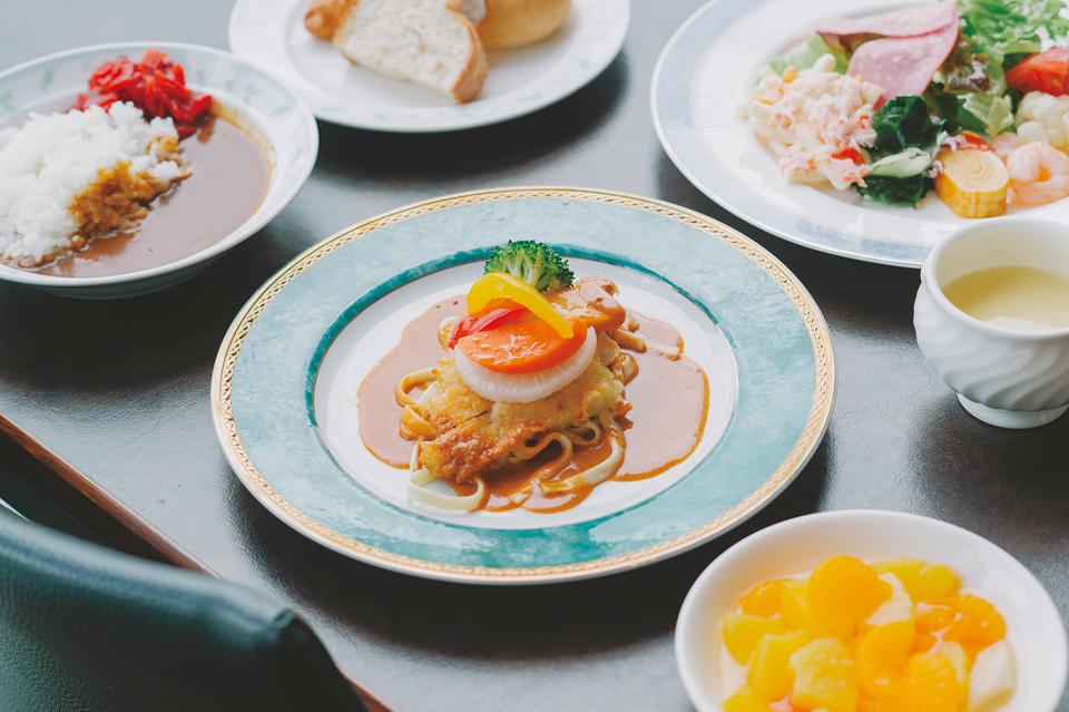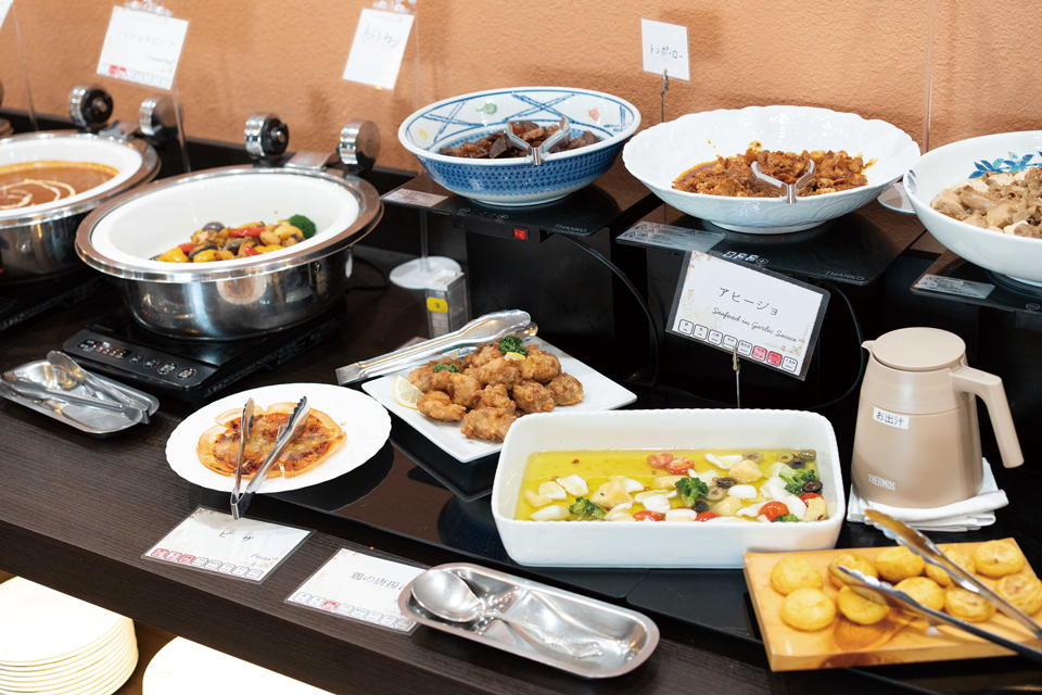 ホテルサンルート徳山内のレストランでは、シェフが腕をふるうブッフェが自慢。料理はデザート・ソフトドリンクを含めて驚きの50種類以上が揃い、魚のエスカベッシュカレー風味や、蒸し鶏マスタード風味チリソースなどが味わえます。目の前で調理するライブキッチンもあり、出来立て料理をぜひ。