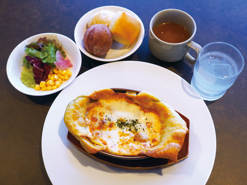 ねをはすHOTEL BOOK&CAFE内のレストランのランチは、パスタやハンバーグなど6種。スープやドリンク、パン、サラダ食べ放題なのも魅力です。中でもお勧めは、萩のむつみ豚をトマトソースと赤ワインで2時間煮込んだあらびき肉が自慢のこちら!種類豊富なパンや季節替わりのビネガードリンクも存分に堪能して。