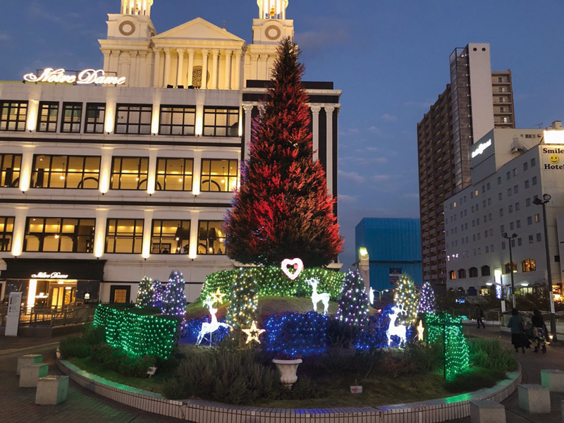 新山口駅北口・南口駅前広場を中心に、チャペルや巨大モニュメントなどのイルミネーションが登場。華やかな光で駅前がクリスマス色に彩られます。
