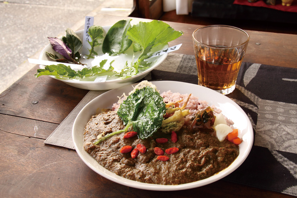 メニューには店主自ら採取することもある山菜や薬草、地野菜を使ったランチが並びますが、オススメはこちらの「つみ菜うどんセット¥850」。