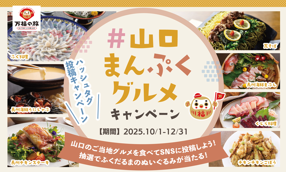 食欲の秋にぴったりのキャンペーン「#山口まんぷくグルメキャンペーン」が、2025年10月1日㈬からスタート!山口県内の対象店舗で指定のご当地グルメを味わい、SNSに投稿すると、抽選で愛らしいふくだるまのぬいぐるみが当たるキャンペーンです。