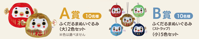 ・A賞(10名様):ふくだるまぬいぐるみ(大)2色セット
