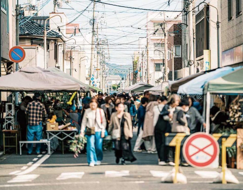 30店舗前後が駅前の通りに並ぶ、年に4回開催されるフリーマーケット。