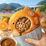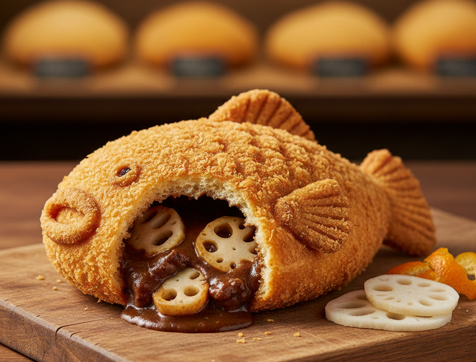 「薄衣サクサクの生地に、山口産の牛肉がゴロゴロの濃厚欧風カレー、中には岩国レンコンがたっぷり、夏みかんがふわりと香る。フグの形で、食べ歩きできるタイプ。」