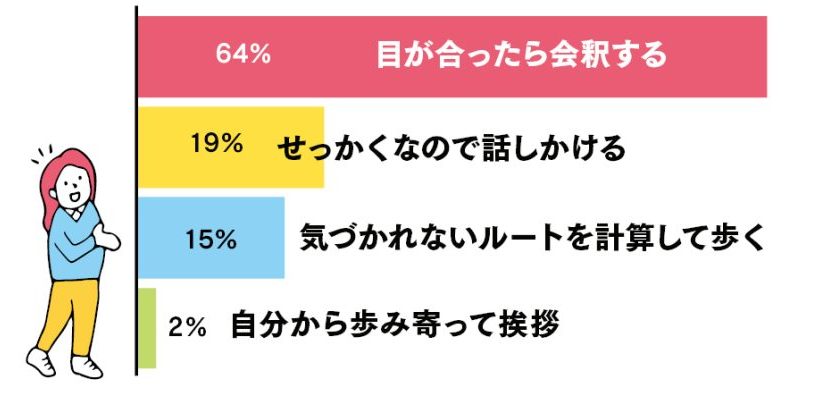 最も多かったのは「目が合ったら会釈」。中には「気づかれないルートを計算して歩く」という猛者も意外と多し。マルシェは自分だけの世界に没入したい時間かもしれませんね。