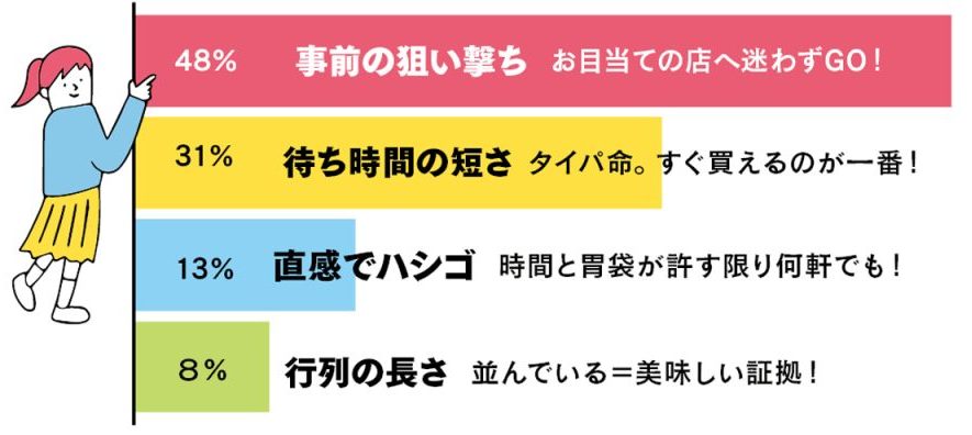 • ・お気に入りの店は売り切れることもあるので、一番に向かいます!あとは余裕があれば。