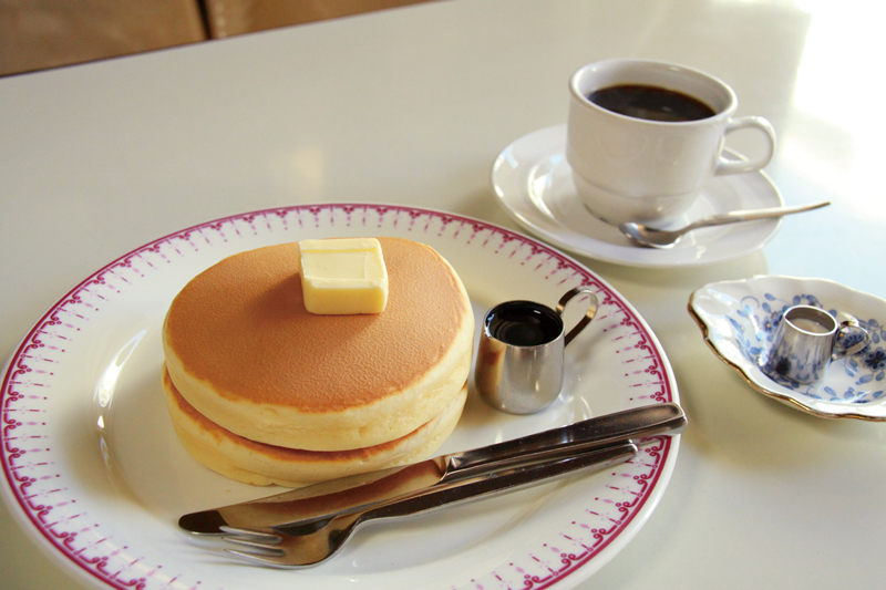 ホットケーキ¥800とブレンドコーヒー¥500(セットは¥1,000)。自家焙煎コーヒーは渋皮を丁寧に取り除くことで、コクがありながらすっきりとした後味に。