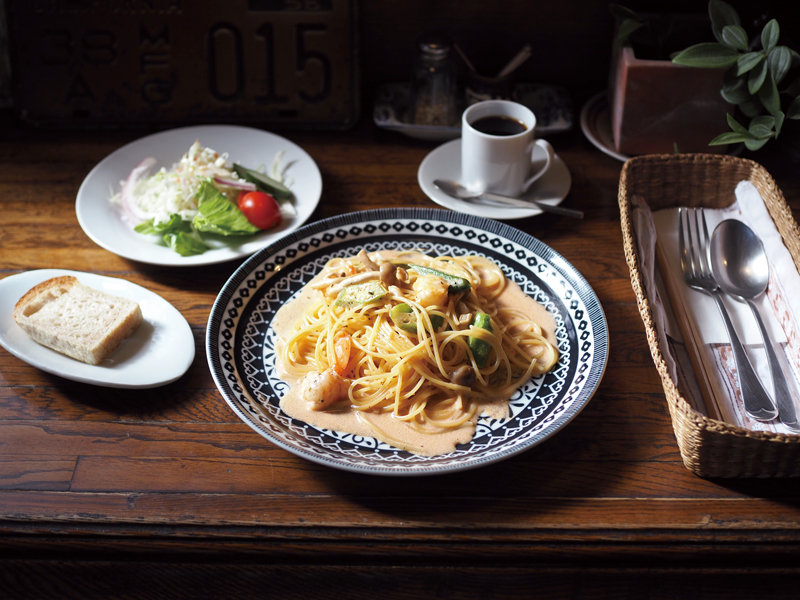 ランチで人気の、日替りパスタ¥1,600(写真の内容は取材時/11:00〜14:30)。宇部のパン屋さん「BENCH」のパンとサラダ、コーヒー付き。