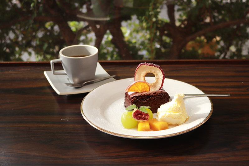 自家製ドライフルーツがのった、ガトーショコラセット¥1,200(限定12個)。