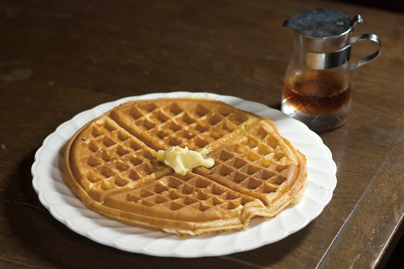 喫茶で長年愛される焼き立てワッフル¥600は、メイプルシロップとバター付き。