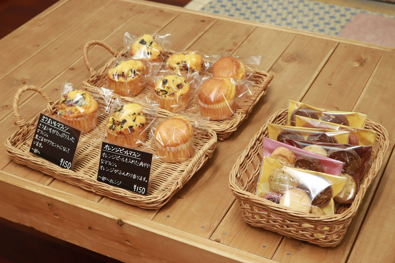 手作りのマフィン¥150やクッキー¥240も販売。焼き菓子などに使うキウイやブルーベリーも自家栽培!