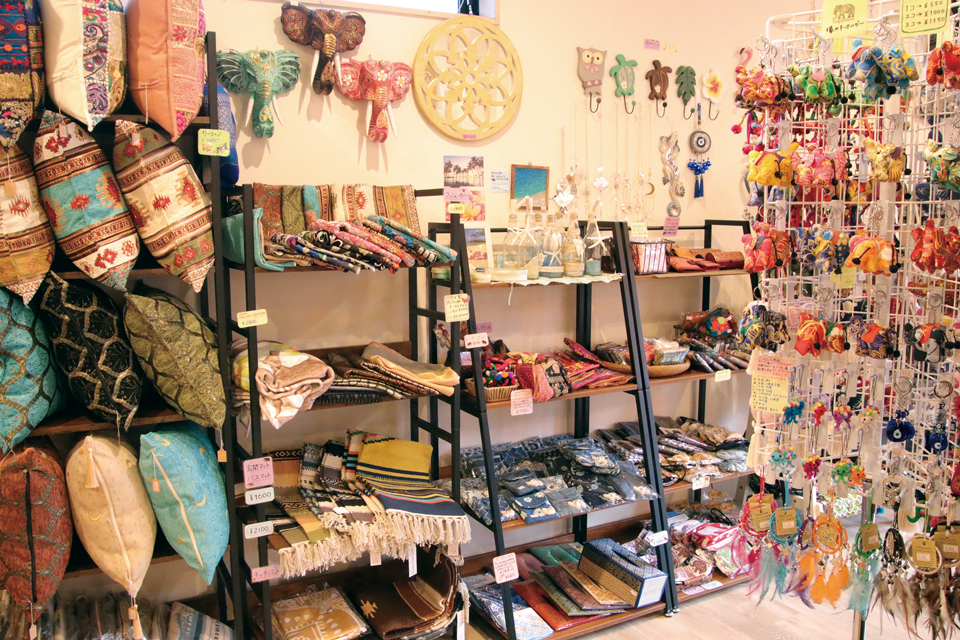 扉を開けると、そこは世界を旅しているようなワクワク感。タイ、バリなどの雑貨、色彩豊かな置物、1つ1つに意味のある天然石や食器などが所狭しと並びます。