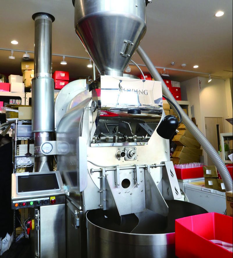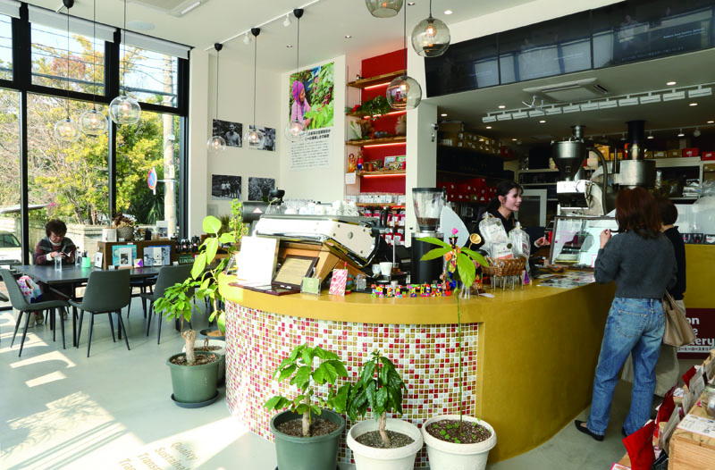 新店舗は花屋さんと美容室が隣り合い、活気ある雰囲気。店内には焙煎機を備え、コーヒーの生豆と焙煎後の変化を間近に感じることができます。