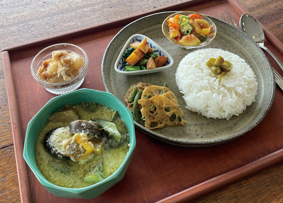 自家栽培唐辛子を使ったグリーンカレーは、なんと辛さを5段階から選べるのが嬉しいポイント!辛いものが苦手な方でも楽しめるよう工夫されています。おかず3種が付いたセットで、里山の恵みが詰まった満足度の高い一品です。