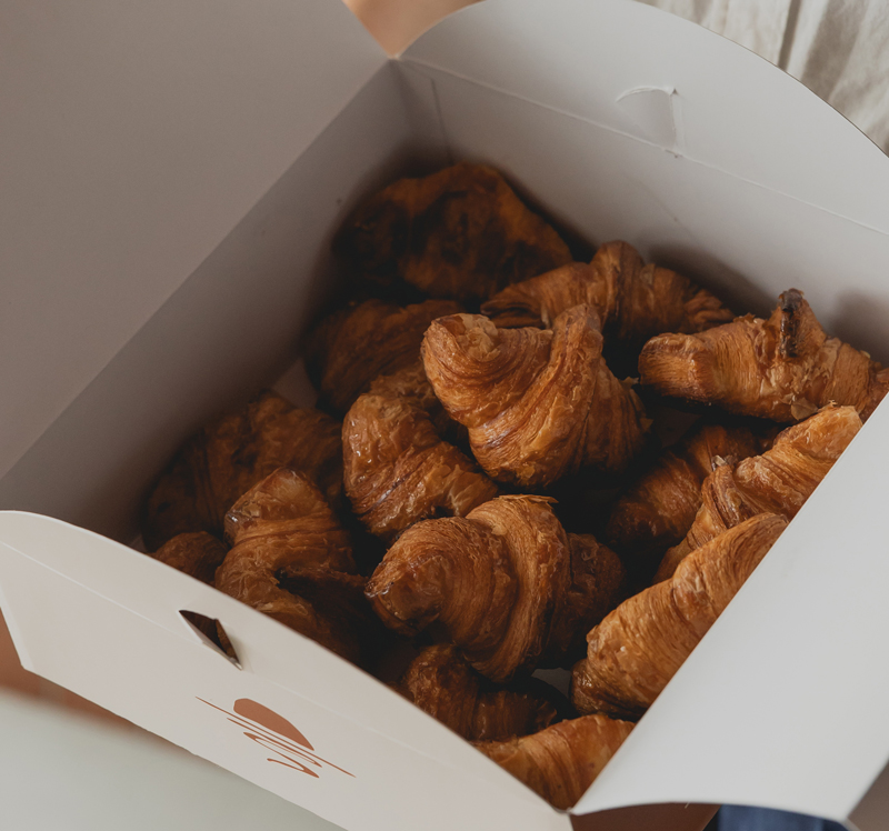 折り込み回数を増やし、オーガニックシュガーをのせて仕上げた一品です。ミニクロワッサンはギフトボックス(小¥100、大¥170)に最大20個入れることもできるので、手土産にもおすすめです。