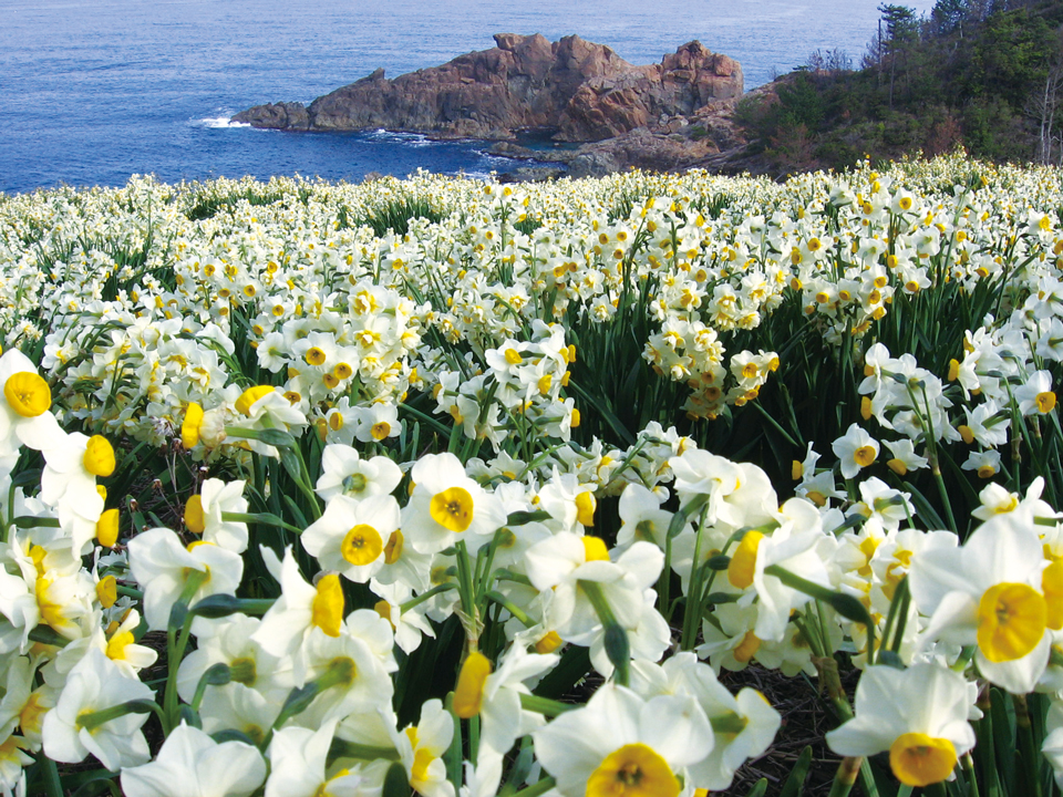 中国地方でも有数の水仙の里として有名な唐音水仙公園。地域の方々の手によって大切に手入れされた200万球を超える水仙が、波打つように咲き誇ります。ダイナミックな海岸線の風景とともに楽しんで。