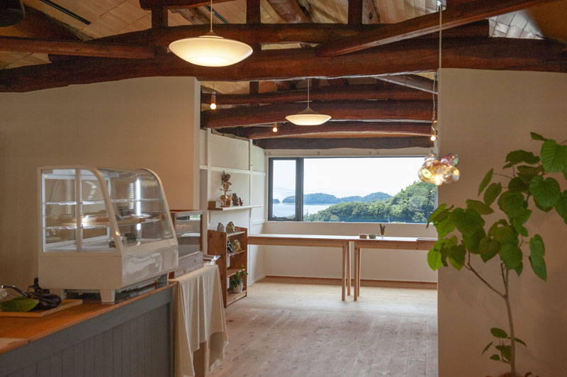 お店は、店主が2年半もの歳月をかけて、自宅の一角をDIYした特別な空間。温かみのある内装に、こだわりが詰まっています。店内奥には、海を眺めながらゆったりと過ごせるカウンター席も。焼き菓子と一緒に、絶景を味わう至福のひとときを過ごしてみてはいかがでしょうか。