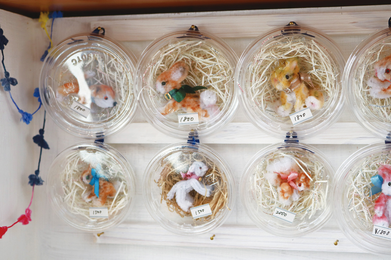 店内を彩るのは、カヌレだけではありません。松村さんお手製の可愛らしいモール人形やイラストのほか、二人の娘さんたちが手掛ける布小物やアクセサリーといった作品も展示・販売されています。