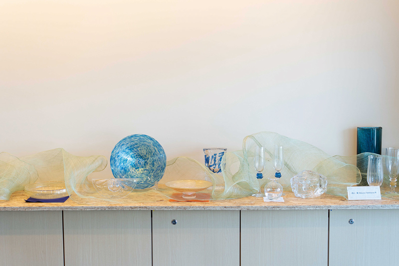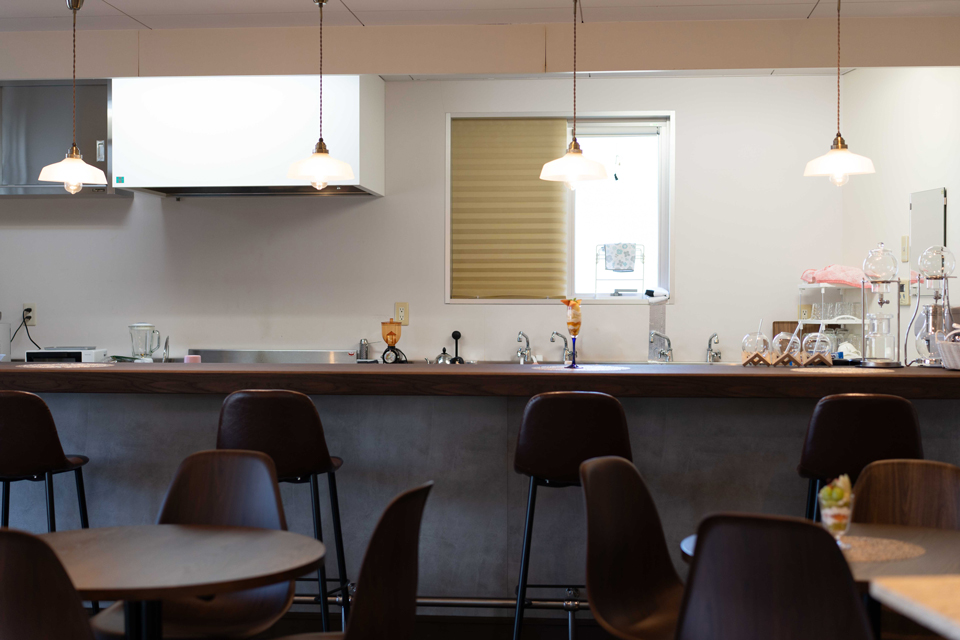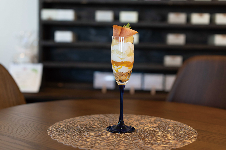 店内には、山陽小野田市を拠点に活動するガラス作家・西川慎さんの美しい作品が飾られ、その世界観を楽しみながらさまざまな味わいを堪能。メニューには創作洋菓子「ロイヤル」のブランデーケーキを使ったこだわりのパフェや、ブランデーケーキセット¥660、「大島珈琲店」のオリジナルブレンドをご用意されています。