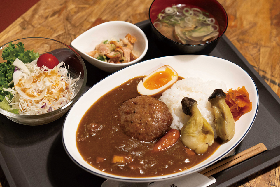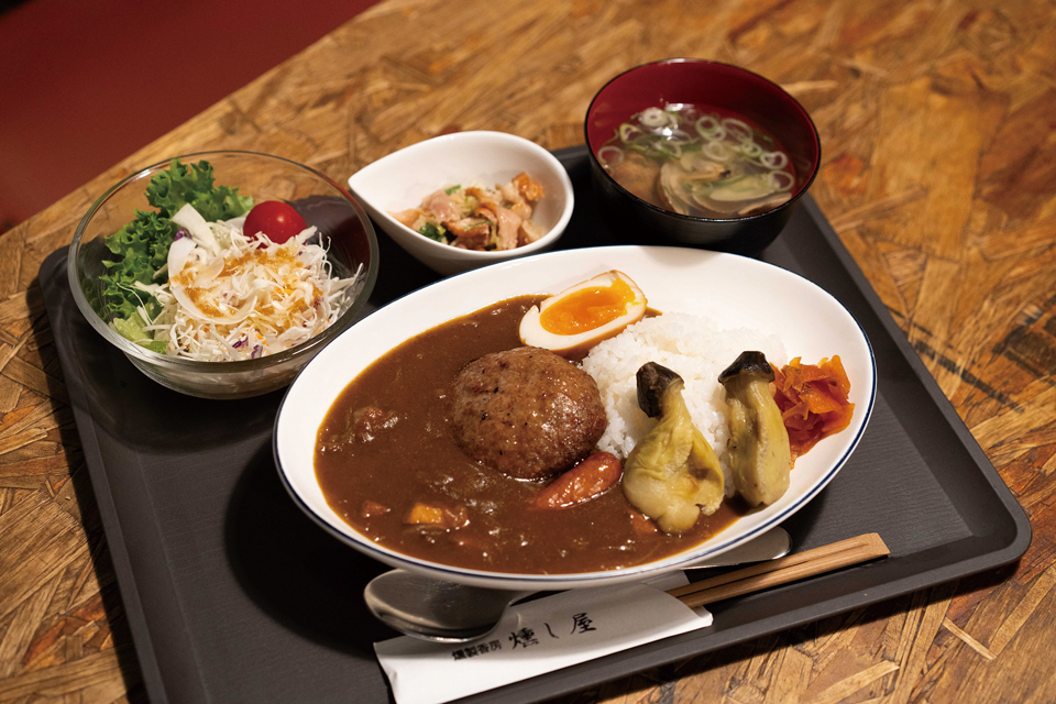 お店のイチオシは「燻しハンバーグカレー定食」。佐賀牛を贅沢に使ったハンバーグを、低温でじっくりと燻すことで旨みを凝縮。スモーキーな香りをまとったジューシーなハンバーグと、スパイシーなカレーが織りなし、小茄子、燻製たまごなど香り立つ燻製トッピングも楽しめます。