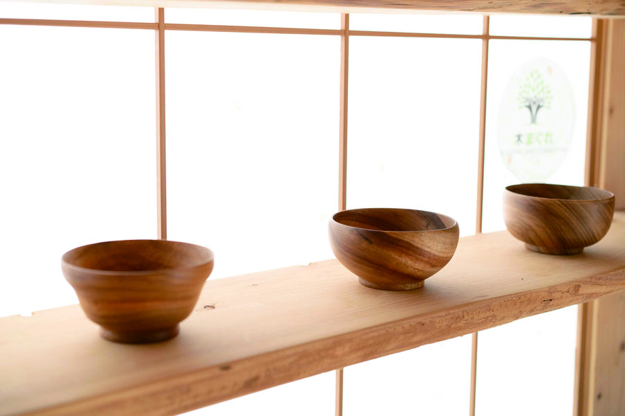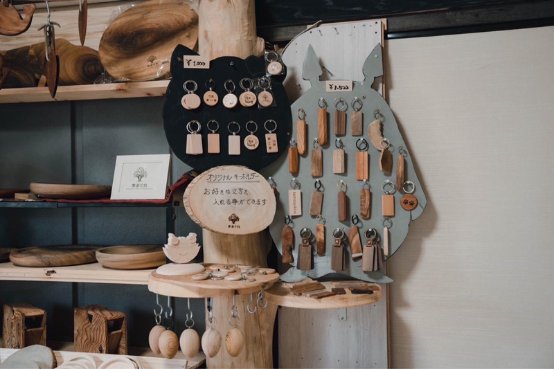 木のお皿やマグカップ、キーホルダーなど、一つとして同じものはありません。木の種類や木目が違うため、全てが世界に一つだけの作品なのです。