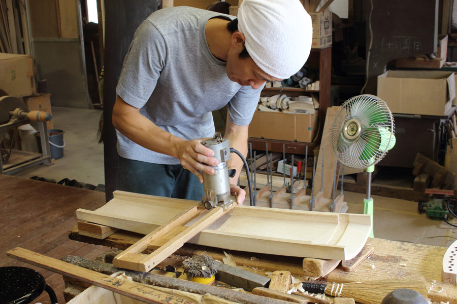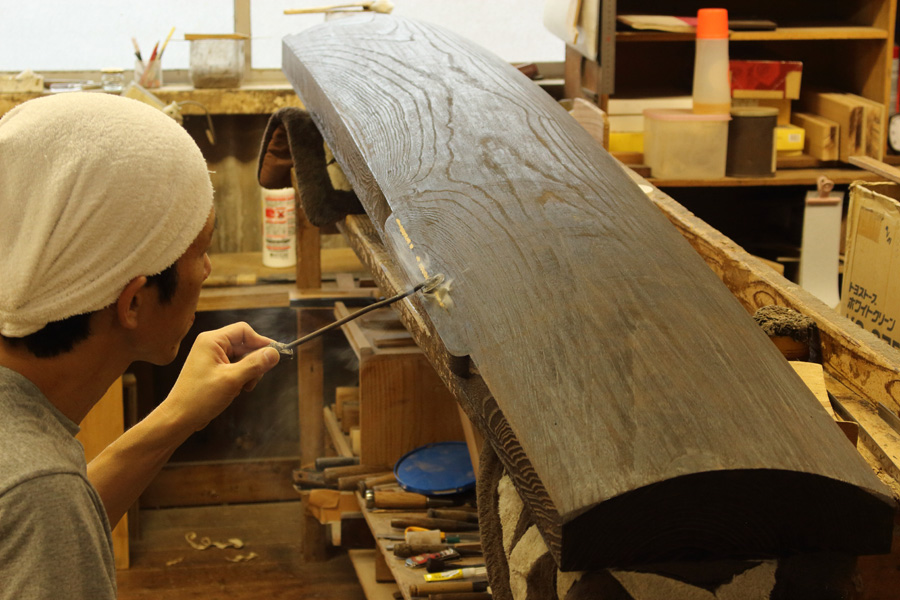 ②琴の本体を削ったり表面を焼いたりする甲作り